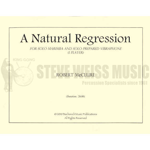 A Natural Regression by Robert McClure is a three movement solo for marimba and prepared vibraphone (one player). Movements 1 and 3 are for marimba and the second is for vibraphone, prepared by placing dimes on the nodes of ten specific bars. Other extended techniques such as bowing, harmonics and pitch bending are also used in this movement. The marimba movements require a five octave marimba and four mallets. Duration: 26 minutes.