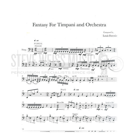 Lou Forestieri's Fantasy for Timpani and Orchestra is a short but challenging work for 5 timpani and orchestra. Melodic writing utilizing well thought out pitch changes exploit the full capabilities of modern pedal timpani. A welcome addition to the repertoire for those occasions when a showcase for the timpanist is desired but a full scale concerto would be too much.