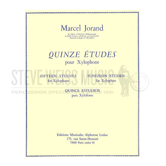 Marcel Jorand's Fifteen Studies for Xylophone is a collection of etudes that centers the students focus on mallet technique, music reading and overall musicianship on the Xylophone.