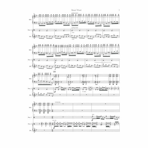 My concept for Desert Wood was to explore new combinations of sounds for the marimba in a duo setting with instruments such as the doumbek, cajon, glockenspiel, and metal instruments like cymbals and gongs etc. The imagery of the music includes Middle Eastern grooves combined with a contemporary marimba vocabulary. The intended result was an earthy musical dialogue with character, passion, and drive.