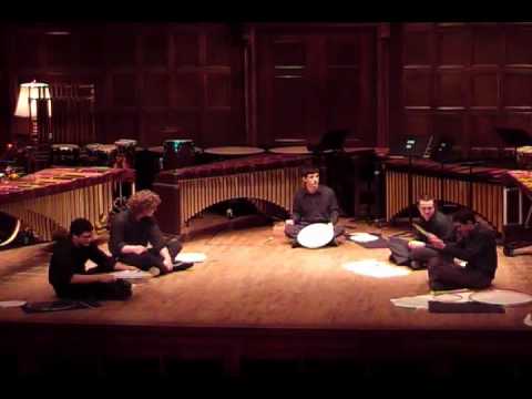 Mark Ford's Head Talk provides the percussion quintet with a dose of sophisticated comic relief. The equipment necessary is somewhat unusual: six pretuned heads--ranging in size from a 10 to a 22; a used 14 snare head; two bongo heads; one 14 coated head; two Pinstripe heads; and five performer-prepared papered-heads for the surprise ending (each performer smashing the drumhead over the head of the drummer!). The five performers must have or develop a controlled sense of humor and must theatrically play off each other. The performers sit on the stage in a semicircle, and Head Talk starts with the pretuned heads being twirled on stage. The opening rhythmic motive has a definitive rock-samba groove to it, and each performer ends up imitating the opening motive. The composition lasts about nine minutes.