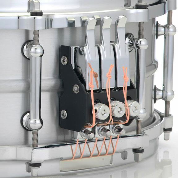 The Pearl SR300A Snare Strainer Release features three separate adjustable throw-offs in one unit. These are typically found on Pearl's line of symphonic snare drums. This allows control of light cable, heavy cable and wire snares, in any combination, providing a wide range of sound options