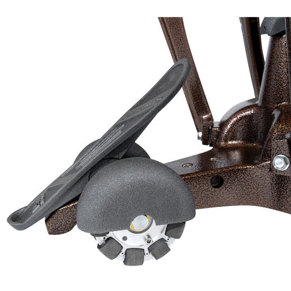 The wheel configuration on the timpani allows for easy transport and secure placement during performance. A third omni wheel placed under the pedal allows for fluid 360 degree movement. The detachable rear casters are designed a little larger and feature braking contributing to the ease of movement and firm placement of the timpani.