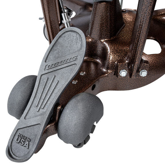 The base features the classic Balanced Action Tuning Pedal which over the years has set a standard of overall timpani pedal design. The main horizontal pull rod connects to the pedal keeping action balanced at both ends of the tuning range. The pedal activated tuning gauge with metal note indicators is fully adjustable and placed on the instrument in a manor that allows for American or German set-up. The tuning pull rod runs seamlessly under the base creating a functional and visually pleasing design.